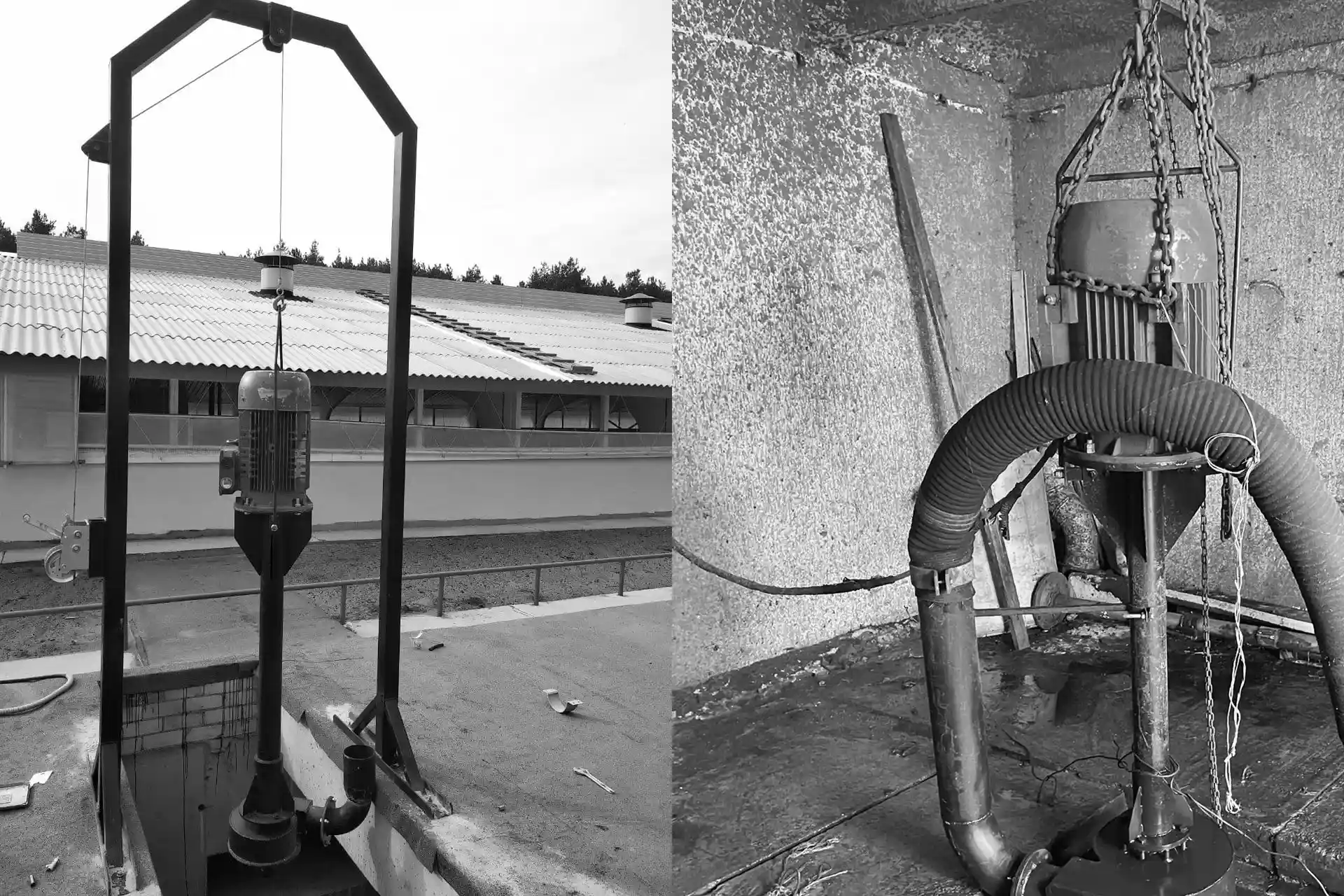 Submersible centrifugal pump VTN-1 is used for pumping manure at livestock complexes and farms, from manure collectors to vehicles, storage facilities, and places for processing (composting processes, separation into liquid and solid fractions). The pump pumps manure mass with low moisture content, as well as if it contains fibrous and coarse-stemmed components (straw, scraps, corn stalks, etc.). The structure of the pump makes it possible to use it both on large complexes and small farms. The pump can be operated in stationary mode, with a pumping range of up to a kilometer, and with the help of mobile units equipped with a lifting device weighing 0.5 tons. In addition, this model mixes the mass in the intake area within a radius of up to 5 m.